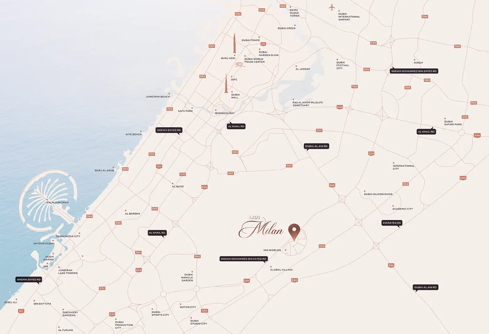 Azizi Milan Heights by Azizi at City of Arabia is a distinguished collection of high-rise residential towers by Azizi Developments, featuring elegantly designed studios and 1 to 3-bedroom apartments. Located within Wadi Al Safaf 4, one of the city’s most anticipated emerging districts, the development introduces a vibrant, contemporary community thoughtfully crafted for modern urban living. Surrounded by lush greenery and supported by excellent connectivity, the project enjoys close proximity to major road networks and prominent landmarks. At its heart, a carefully designed podium landscape showcases a captivating blue lagoon and expansive green spaces, encouraging relaxation, social connection, and overall well-being for residents.