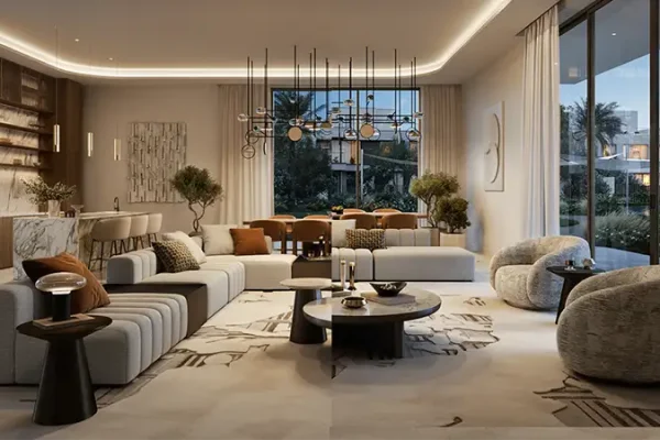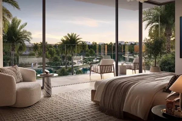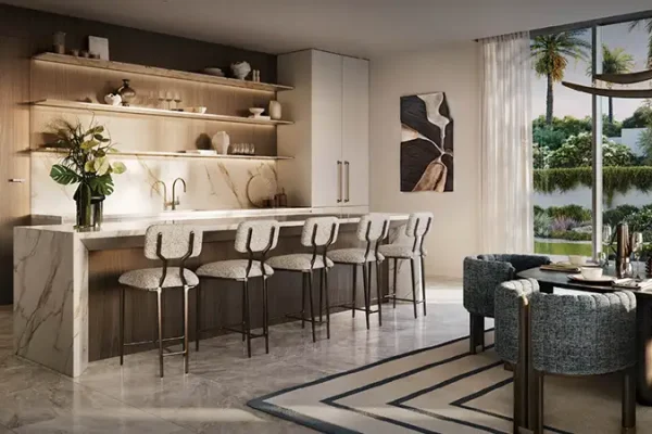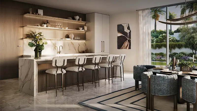 Interiors are inspired by flowing water elements and the calming influence of nature. Soft neutral palettes, earthy tones, and elegant finishes create a serene atmosphere that celebrates understated luxury. Every residence is meticulously crafted to reflect the art of refined living, featuring marble finished interiors, expansive terraces or balconies, and uninterrupted views of verdant landscapes or tranquil lagoons. Grand living spaces are enhanced with floor to ceiling windows, direct access to private swimming pools, outdoor lounges, and landscaped backyards ensuring a seamless connection between indoor luxury and outdoor serenity.