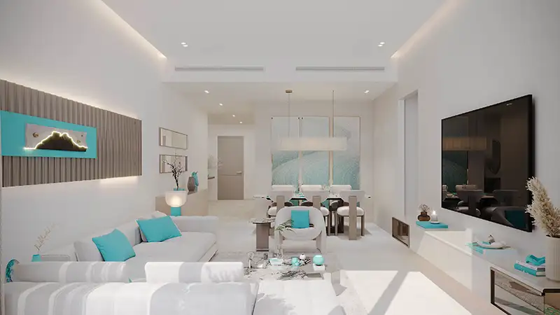 Each residence is meticulously crafted to balance timeless elegance, functionality, and comfort. Interiors are refreshed with soothing colour palettes, featuring light blue accents and harmonious tones. Open plan living areas seamlessly combine seating, dining, and kitchen spaces, creating a fluid and practical layout for modern living. Bedrooms are designed as private sanctuaries, offering tranquillity and privacy for restful living.