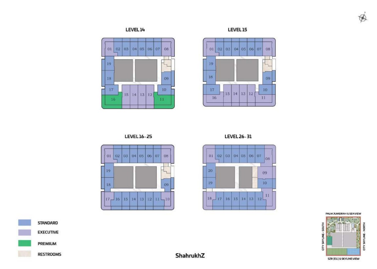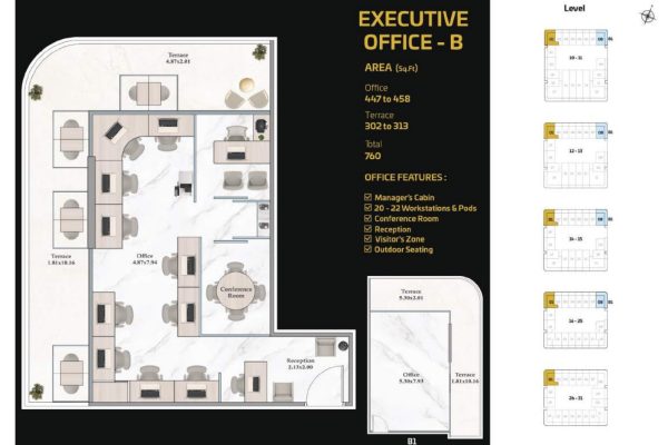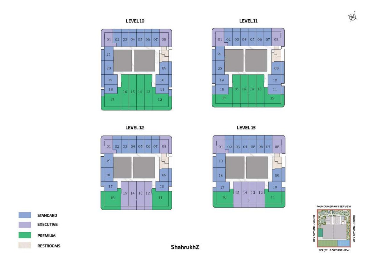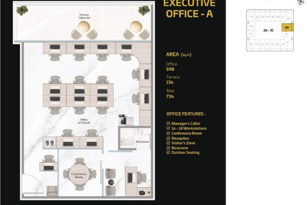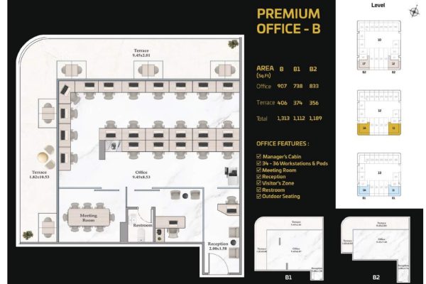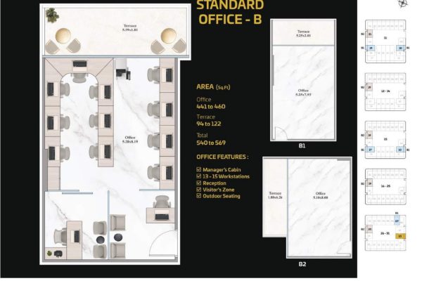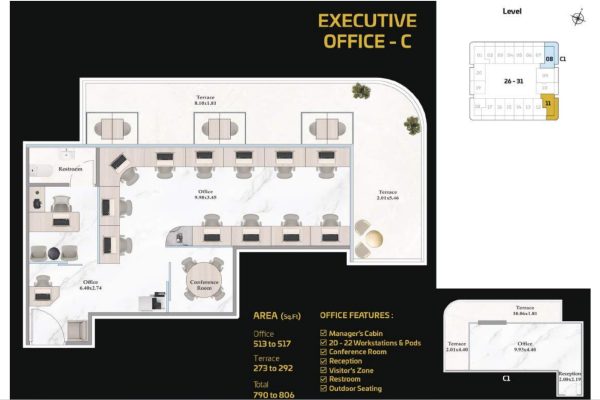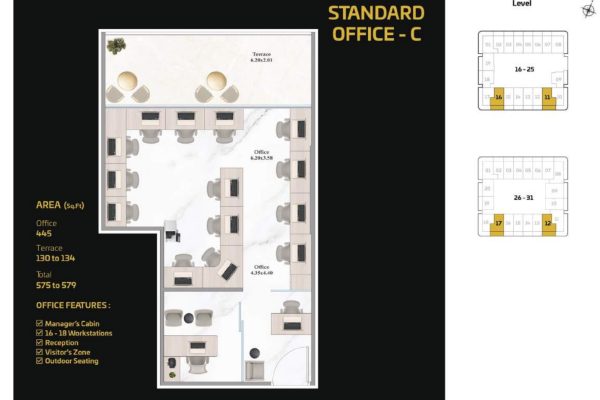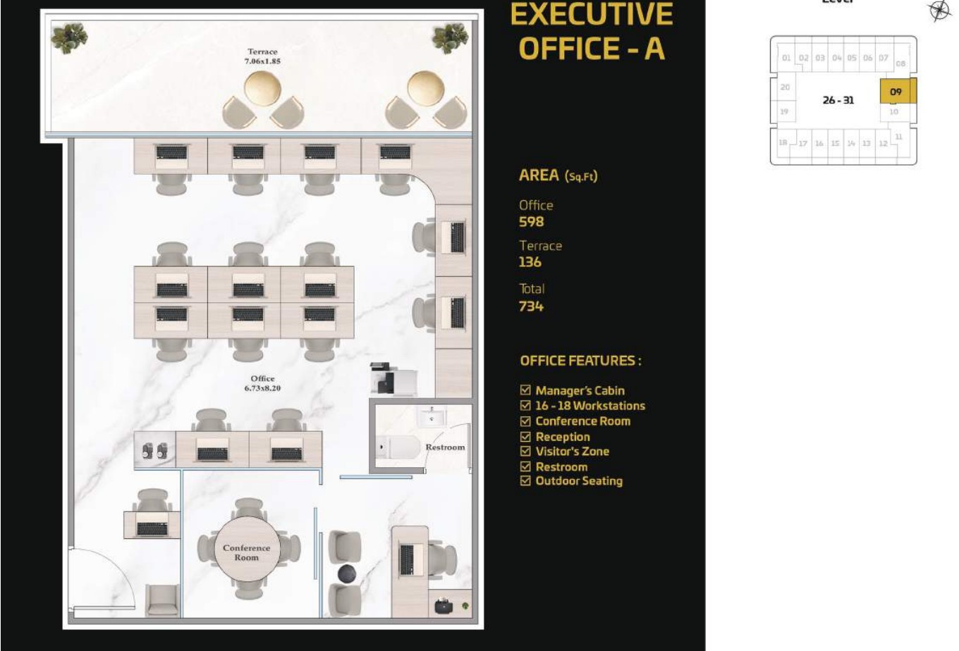 The tower presents a diverse portfolio of cutting-edge office spaces tailored to varying business needs and work styles. Standard Offices are thoughtfully designed to accommodate 13 to 15 workstations, including a manager’s cabin, reception area, visitor zone, and outdoor seating. Executive Offices provide space for 18 to 20 workstations, while Premium Offices cater to larger teams with 38 to 40 workstations. Both Executive and Premium layouts include additional facilities such as meeting rooms, restrooms, reception areas, visitor zones, and outdoor seating.