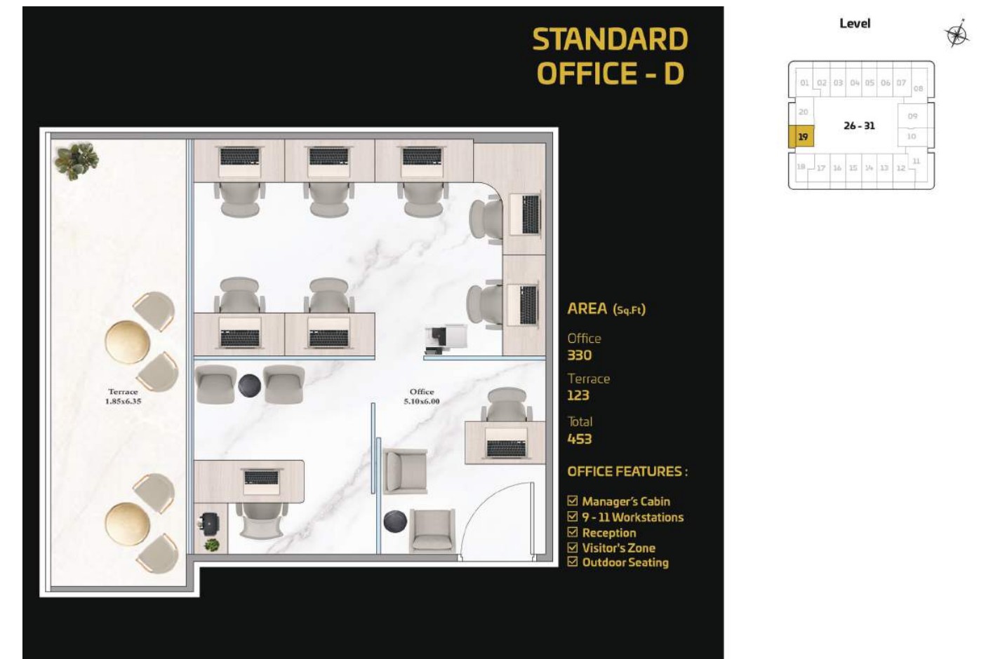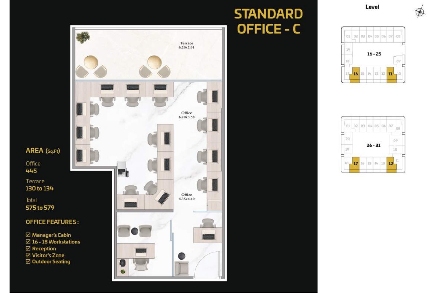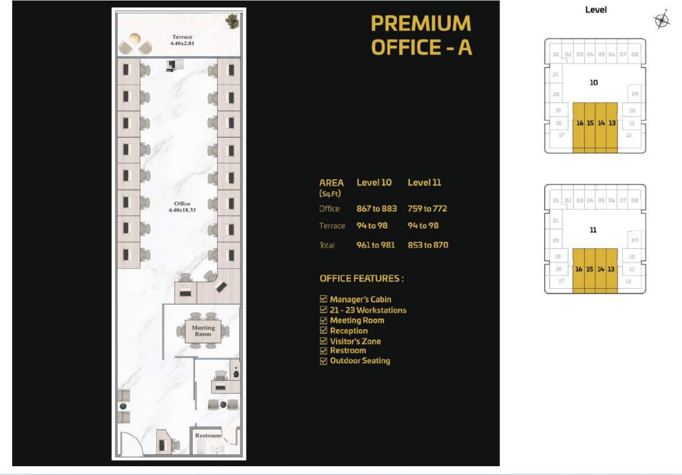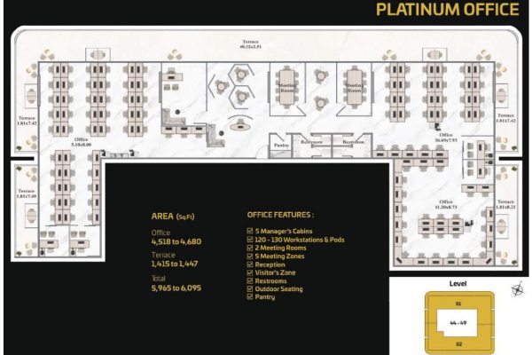 The tower presents a diverse portfolio of cutting-edge office spaces tailored to varying business needs and work styles. Standard Offices are thoughtfully designed to accommodate 13 to 15 workstations, including a manager’s cabin, reception area, visitor zone, and outdoor seating. Executive Offices provide space for 18 to 20 workstations, while Premium Offices cater to larger teams with 38 to 40 workstations. Both Executive and Premium layouts include additional facilities such as meeting rooms, restrooms, reception areas, visitor zones, and outdoor seating.