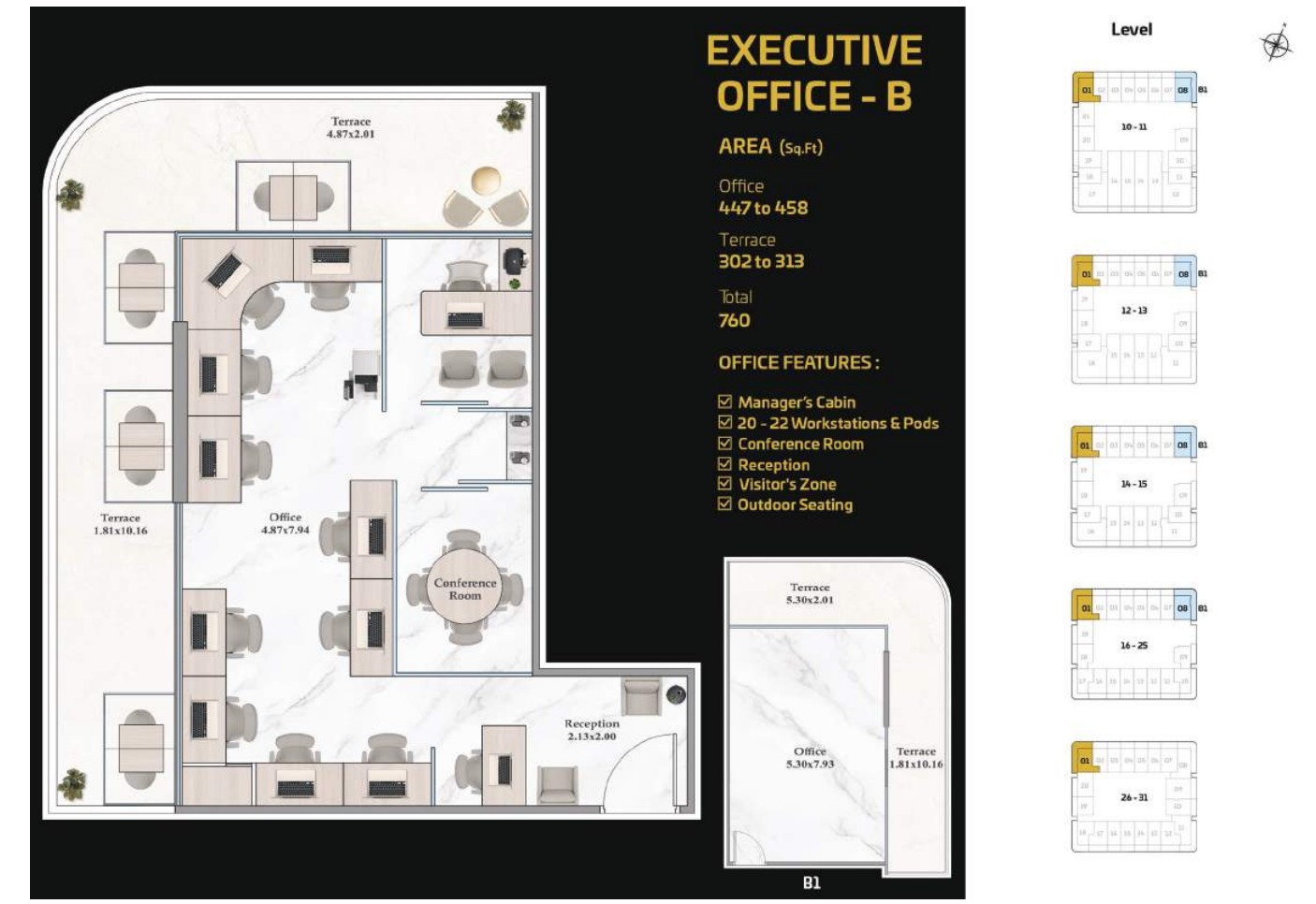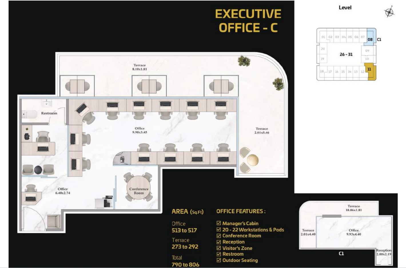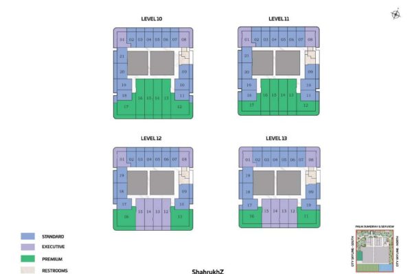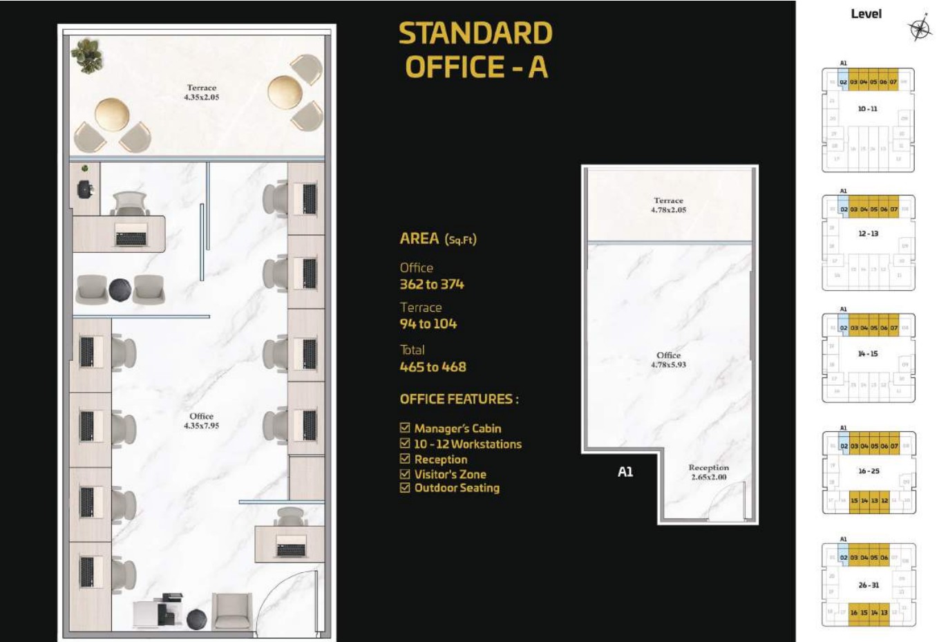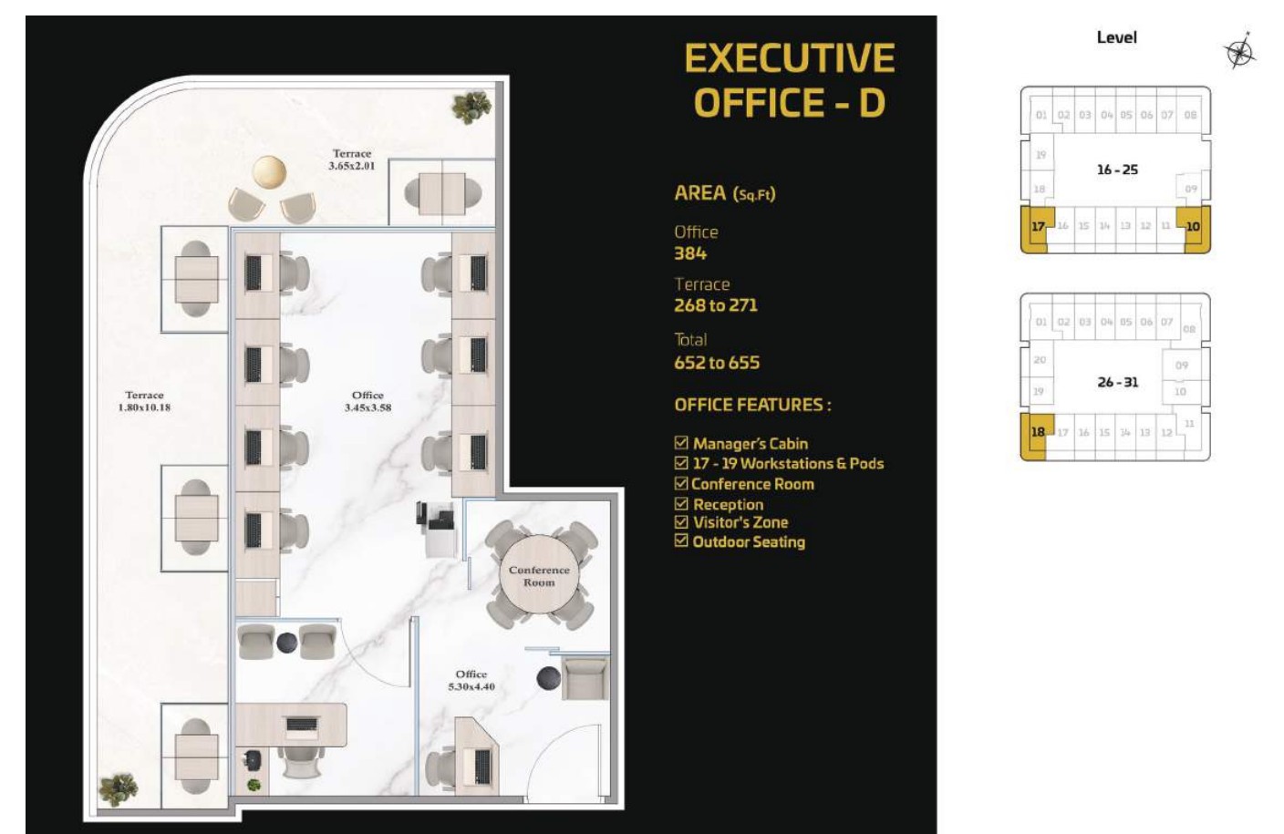 The tower presents a diverse portfolio of cutting-edge office spaces tailored to varying business needs and work styles. Standard Offices are thoughtfully designed to accommodate 13 to 15 workstations, including a manager’s cabin, reception area, visitor zone, and outdoor seating. Executive Offices provide space for 18 to 20 workstations, while Premium Offices cater to larger teams with 38 to 40 workstations. Both Executive and Premium layouts include additional facilities such as meeting rooms, restrooms, reception areas, visitor zones, and outdoor seating.