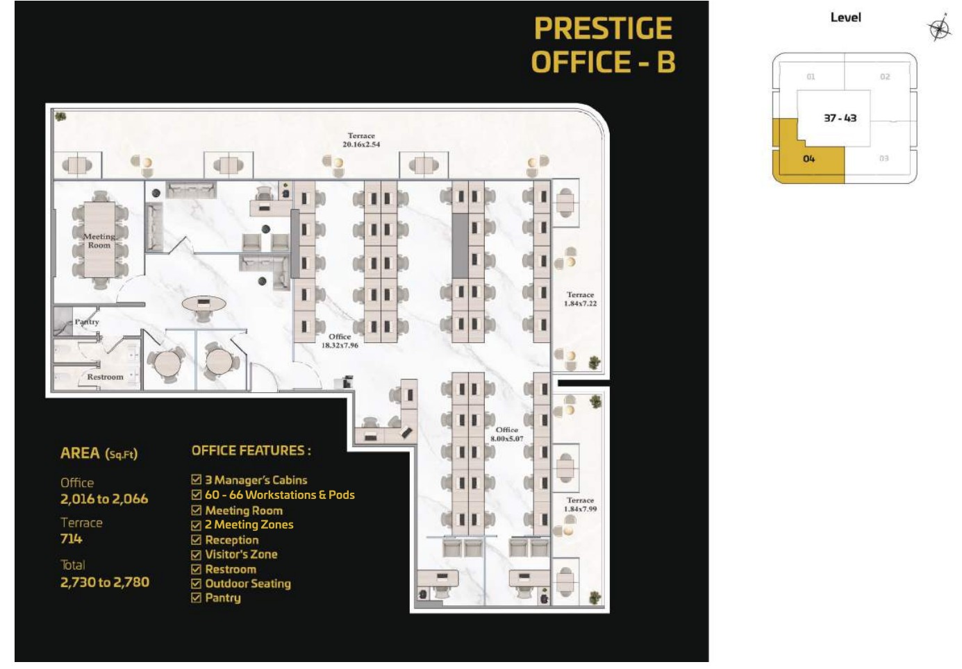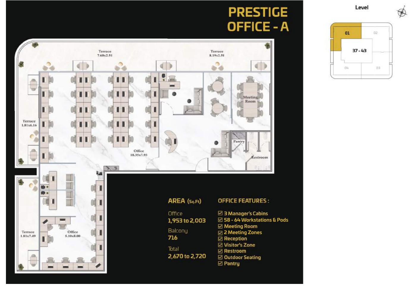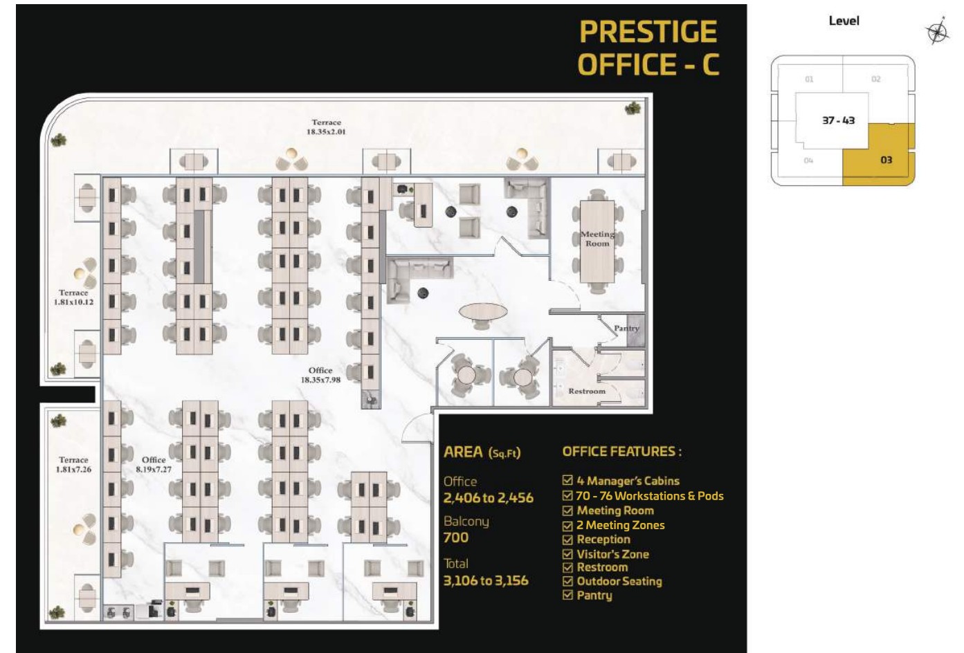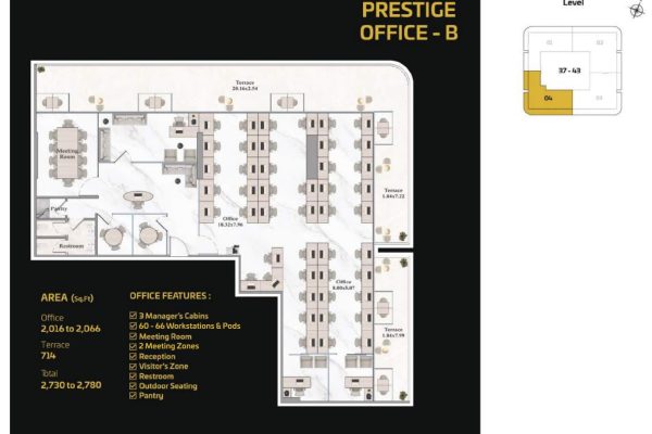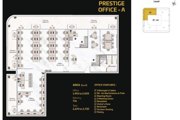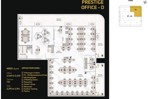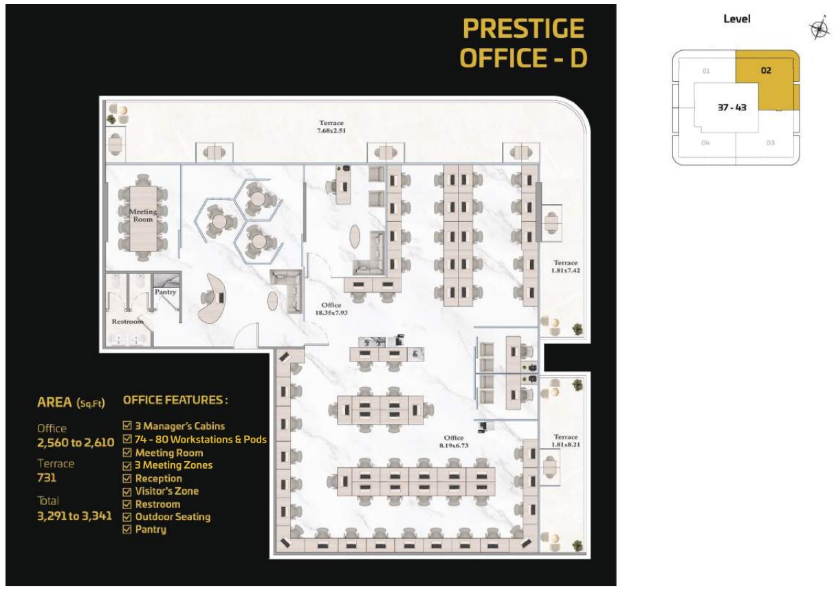 For businesses seeking complete customization, the Prestige Offices offer expansive, flexible layouts capable of accommodating anywhere from 5 to 200 workspaces. These premium units allow organizations to design an exceptional, personalized work environment and include essential and leisure spaces such as manager cabins, conference rooms, workstations, reception and visitor zones, restrooms, outdoor seating, and pantry facilities delivering a truly elevated and bespoke corporate experience.