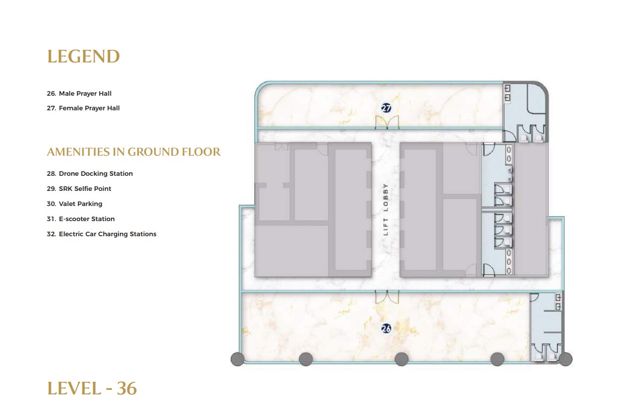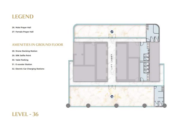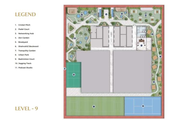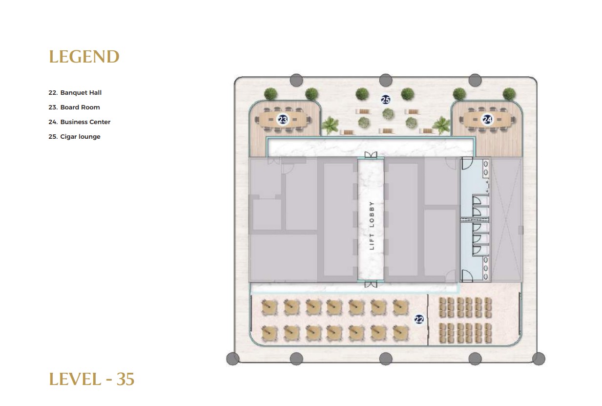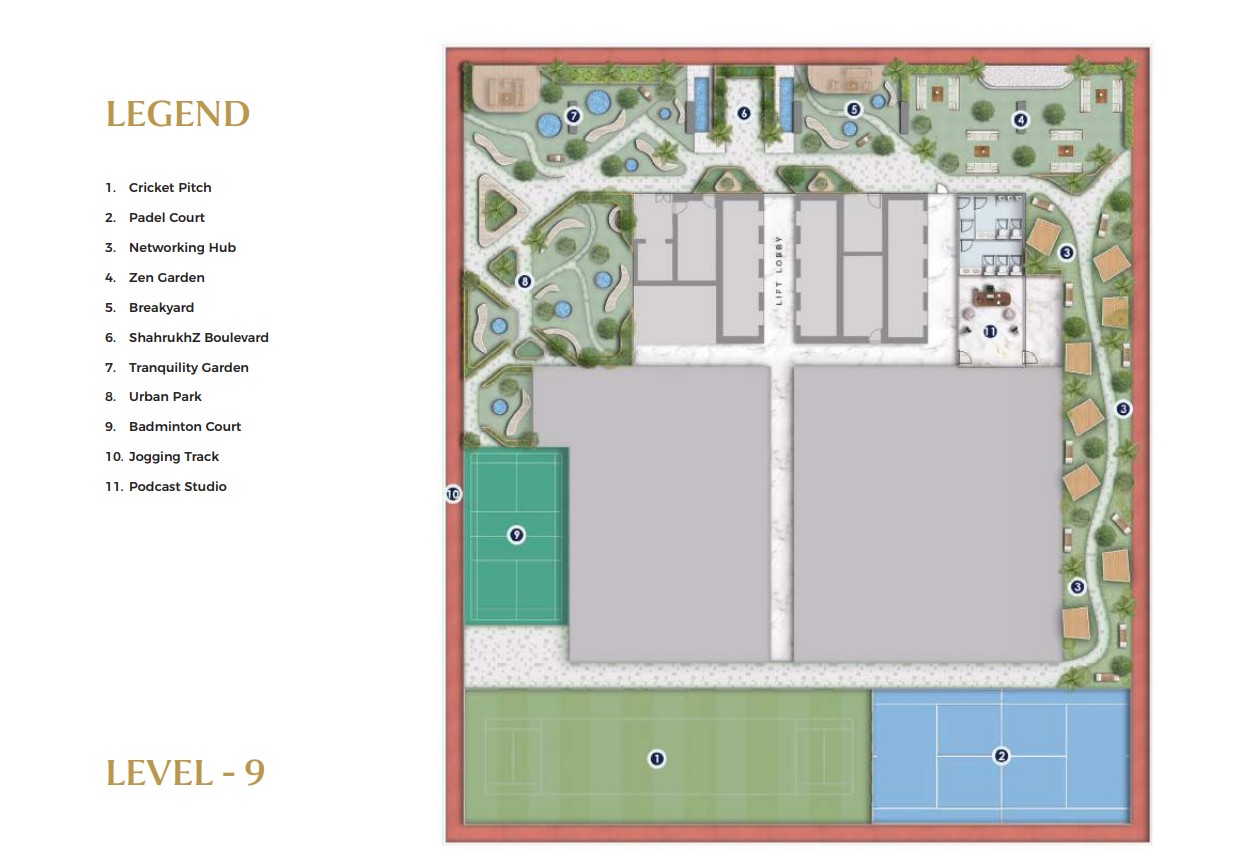 Multiple levels of the tower are dedicated to world-class lifestyle and business amenities. Level 9 offers a serene Zen garden, cricket pitch, padel court, urban park, jogging track, and a podcast studio, supporting balance between work and recreation. Levels 33 to 35 are designed as elevated leisure and networking zones, featuring a sky pool, fully equipped gym, Lounge 33, clubhouse, multipurpose hall, and meeting rooms ideal for wellness, relaxation, and both formal and informal engagements.